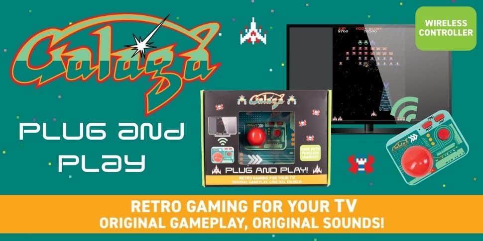 Stylish Galaga-themed controller requires 3x AAA batteries (not included.)